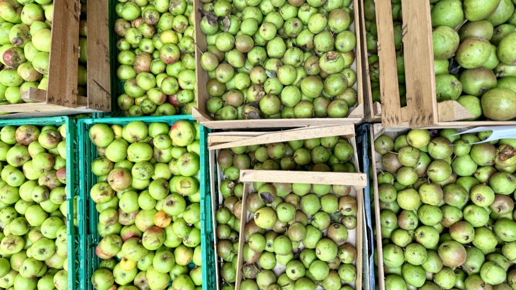 Les cidres et jus Mazette sont issus de pommes non traitées que nous confient des propriétaires d’arbres ou achetés dans des régions voisines.